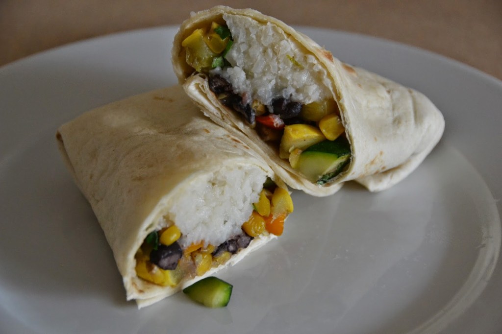 - To assemble the burrito, lay out each tortilla on your work surface. Spoon on rice, then sprinkle on sauteed veggies. Top with chopped tomato, cheese, and any other topping you’d like. Tuck in the sides, then roll the burrito up as tightly as you can. Cut in half and chow down!