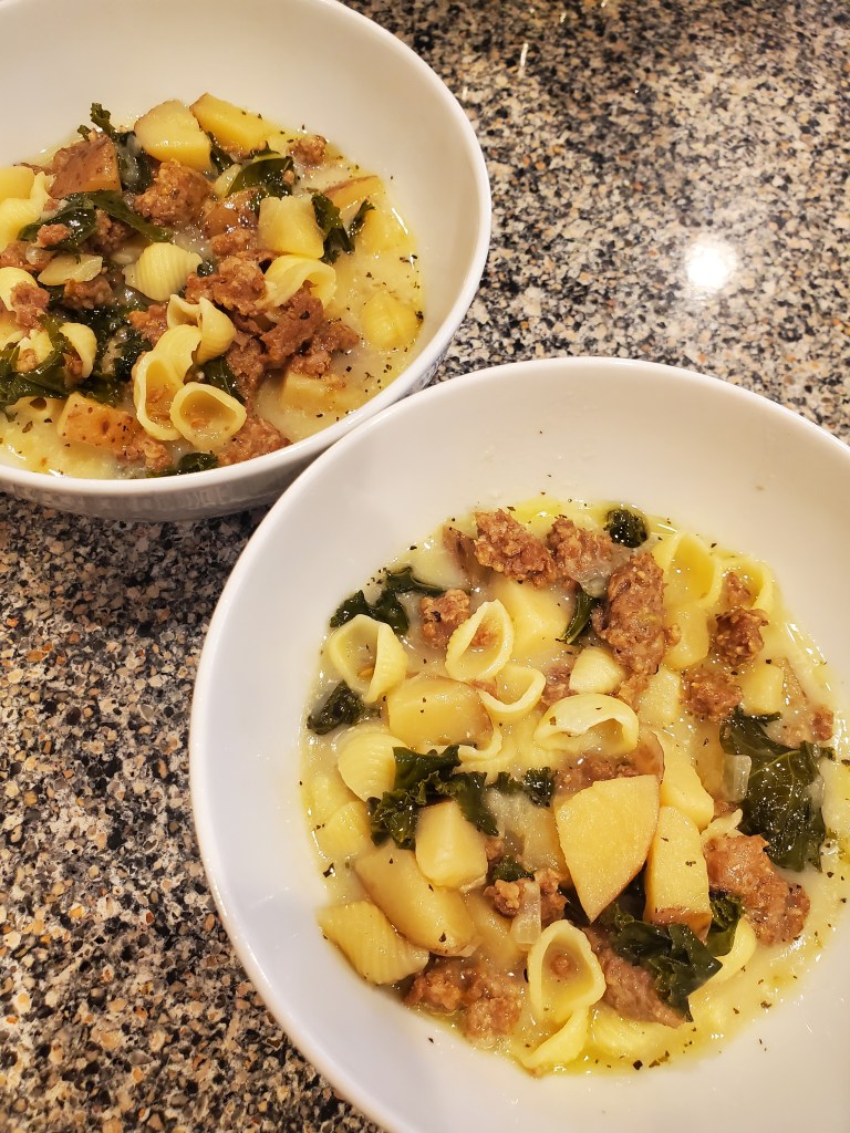 In a large pot, cook meat, diced onions, all spices, garlic, and butter. Cook until meat is almost fully cooked, then add chicken broth & potatoes. Turn stove down to lowest heat possible and let sit for 4-5 hours. This time is pretty much up to you… if doing in a crockpot, let sit until you get home from work, or whatever your situation is. I let mine sit on low from about 10am-4:00pm usually. About an hour before wanting to serve, dice up kale, half and half, and shells. Cook on low to medium heat until you are ready to serve. We top ours with fresh parmesan, and eat with dinner rolls!
