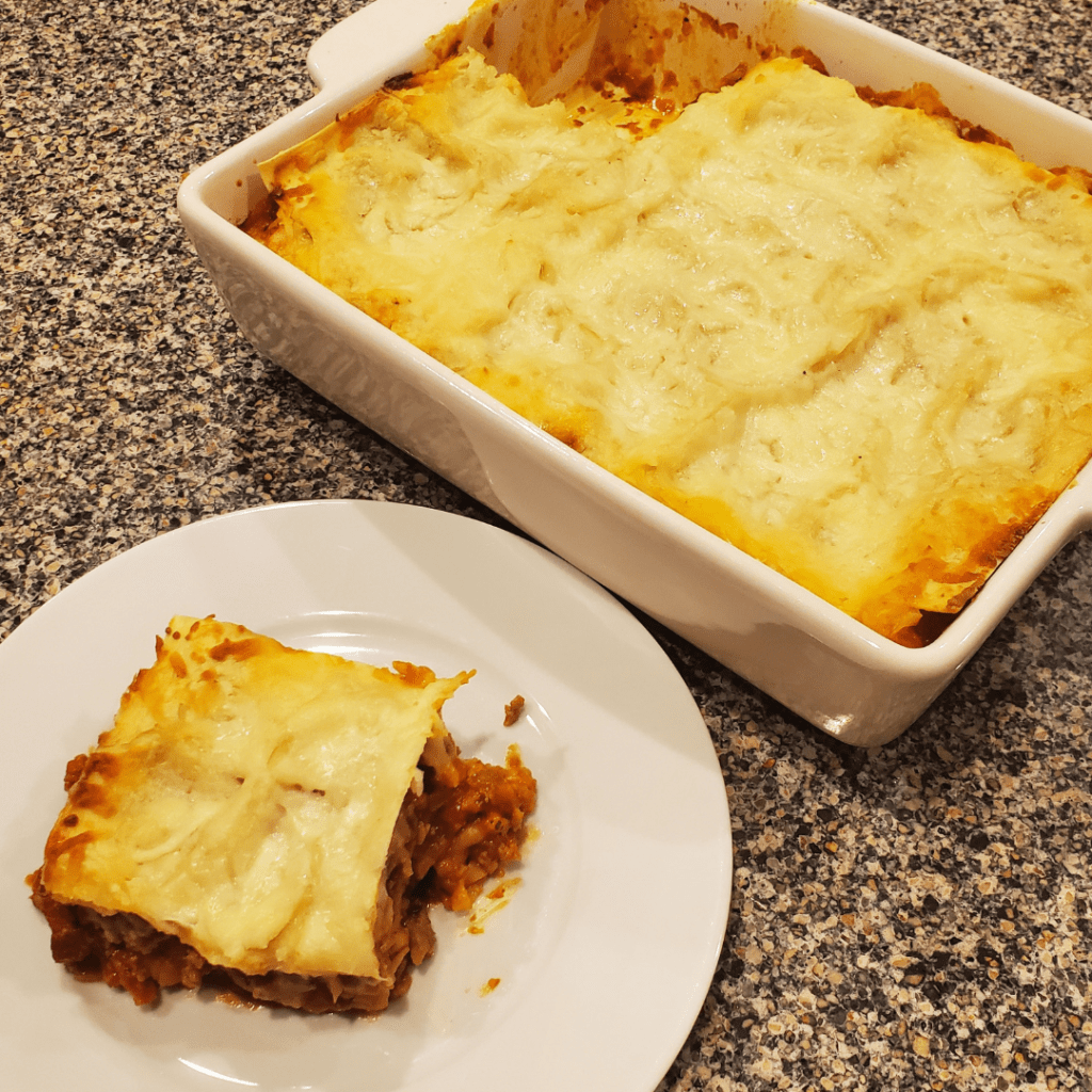 - Cover the top layer of the lasagna with white sauce and mozzarella and bake in the oven for 45 minutes or until bubbling and golden brown.
