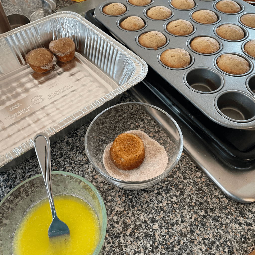 - Meanwhile, make cinnamon & sugar topping: Combine the sugar and cinnamon in a small bowl. Put melted butter in a separate bowl (microwaved 15 sec increments to melt). Dip muffin tops into melted butter and then into cinnamon-sugar. Serve warm or let cool completely.
