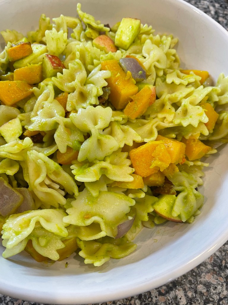 - Add the remaining roasted squash and onion to the mixing bowl with the pasta, along with the chopped apples and butternut squash dressing, and toss to combine. Taste for seasoning and serve warm, or chill at least 3 hours to serve cold.
