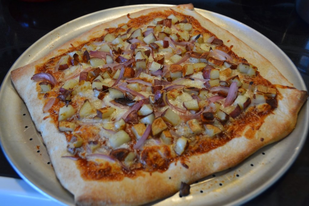 I roast the potatoes for about a half hour in the oven 425°F with a little olive oil, salt & pepper. I also roasted the onions with the potatoes prior to putting them on the pizza, that way I didn’t have to slice them as thinly and they wouldn’t have as strong of an onion flavor.